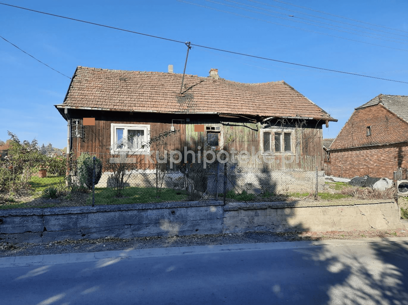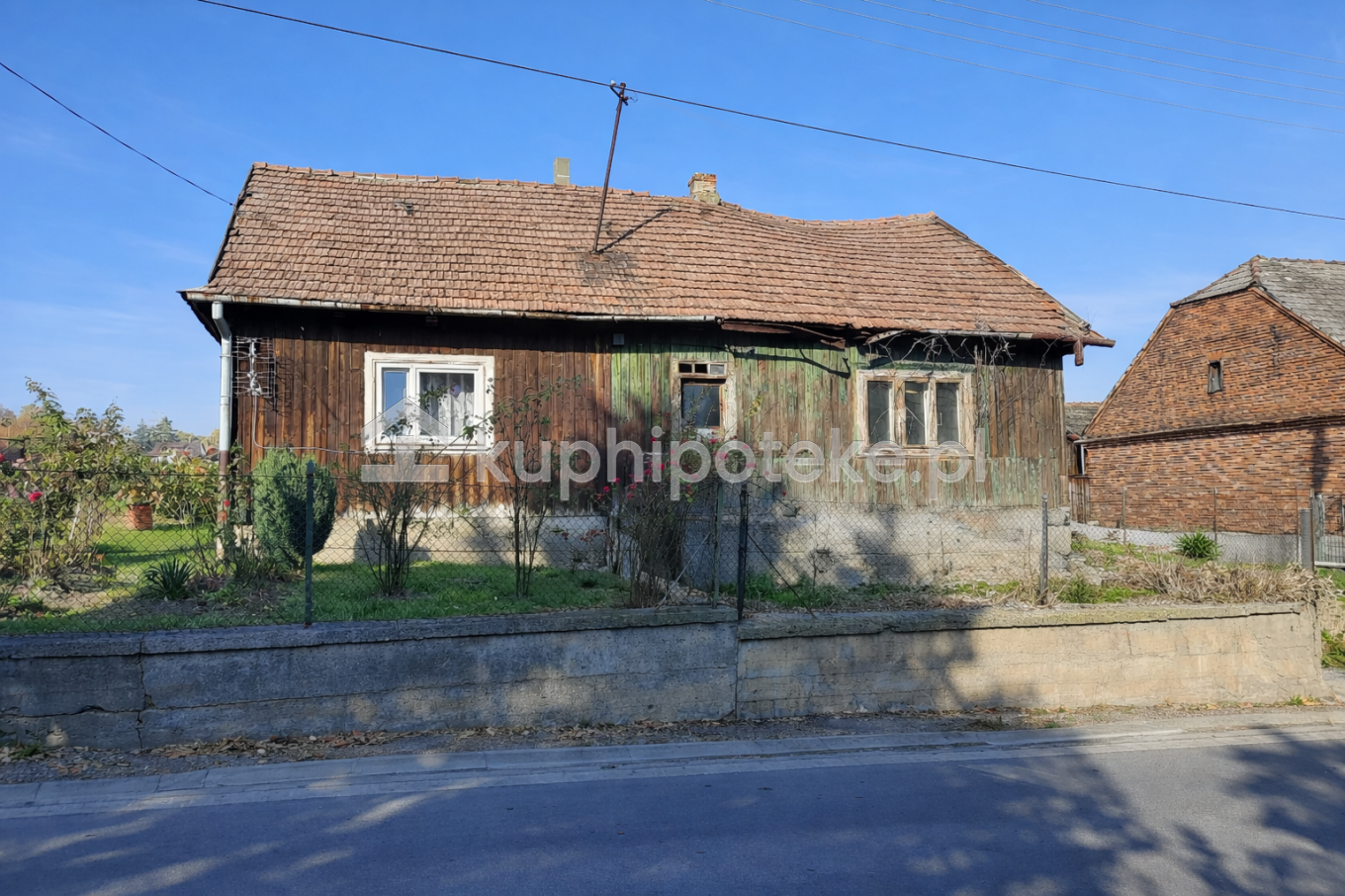 Grunt zabudowany drewnianym budynkiem mieszkalnym w zabudowie bliźniaczej o pow. użytkowej 45 m2 i stodołą. Budynek położony w miejscowości Węgrzyce, w woj. małopolskim. Elewacja zewnętrzna budynku mieszkalnego w stanie złym.